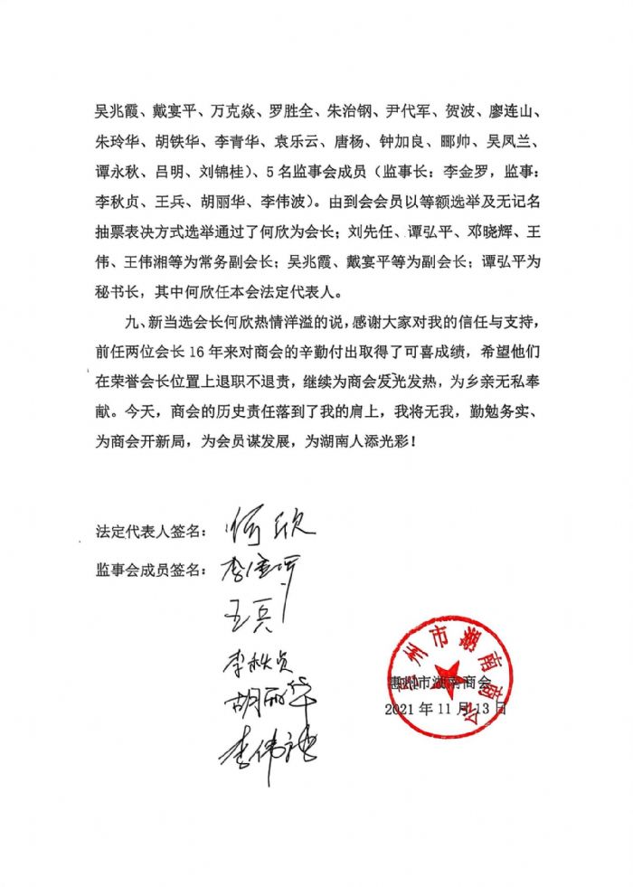 新当选会长何欣发表了热情洋溢的就职演说:感谢大家对我的信任与支持;感谢左宗德、余正明两位会长16年来对商会的辛勤付出和取得可喜成绩,希望他们在荣誉会长位置上退职不退责,继续为商会发光发热,为乡亲无私奉献。今天,商会的历史责任落到了我的肩上,我将无我、不负大家,勤勉务实、励精独行,为商会开新局,为会员谋发展,为湖南人添光彩!何会长强调:商会是所有会员的商会,商会平台资源愿为所有会员服务。铁打的营盘流水的兵,商会组织会不断有人退出,也会不断有人进来,退出的我们为他们祝福,进来的我们感恩缘分走到了一起,大家携手前进。众人拾柴火焰高,希望大家凝心聚力,抱团取暖,都为商会添砖瓦,多为商会做贡献,把惠州市湖南商会打造成:资源共享,互帮互助,正能量满满,热爱祖国,永远跟党走的五好商会!