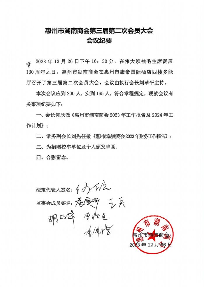 理事会审议通过《惠州市湖南商会2023年工作报告及2024年工作计划》;审议通过《惠州市湖南商会2023年财务工作报告》;表决通过新增副会长朱建军,会员大会上还为捐赠校车单位及个人颁发了荣誉牌匾,大会取得圆满成功。