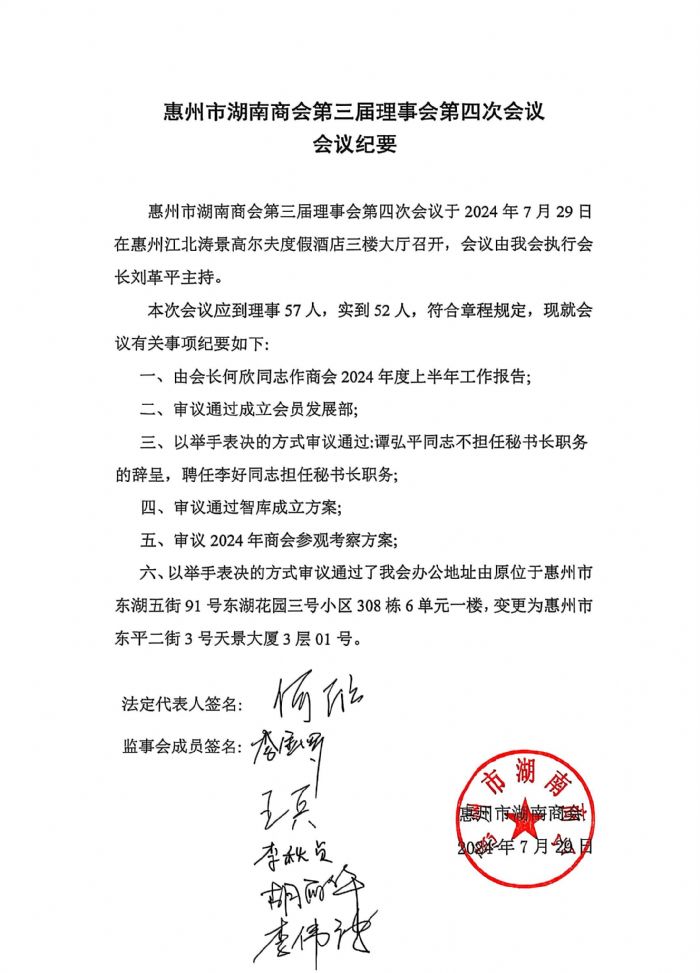 会上,以举手表决的方式通过了商会办公地址的变更,原位于惠州市东湖五街91号东湖花园三号小区308栋6单元一楼,变更为惠州市惠城区东平二街3号天景大厦3楼01号,新的办公地址将为商会的发展带来新的机遇。更好地服务会员企业,凝聚和团结在惠湘籍商会,惠及更多在惠湘籍企业及在惠80万湖南人。